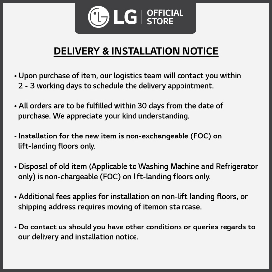Disposal of old item (Applicable to Washing machine and Refrigerator only) is non-chargeable (FOC) on lift-landing floors only.