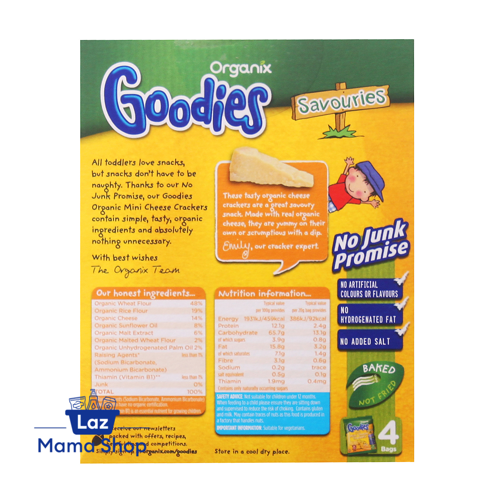 Organic. No junk promise. Baked not fried. With real cheese. No artificial colours, flavours or hydrogenated fat All toddlers love snacks and thanks to our no junk promise, our Goodies Mini Cheese Crackers contain only simple, tasty 100% organic ingredients and absolutely nothing unnecessary. Goodies Mini Crackers are ideal for a light snack or the perfect addition to a lunch box.