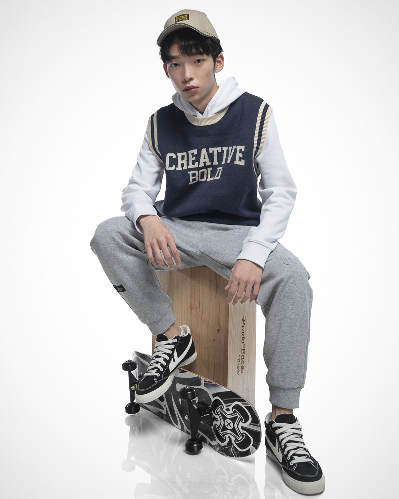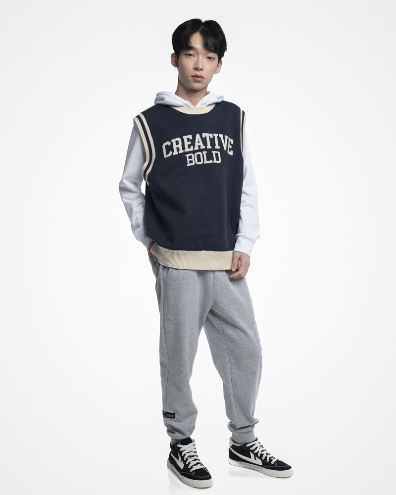 Regular Knitted Round Neck Varsity Vest With Asymmetrical Contrast Coloured Neckline and Hem. Comes with CREATIVE BOLD Slogan at the front. Made of cotton.