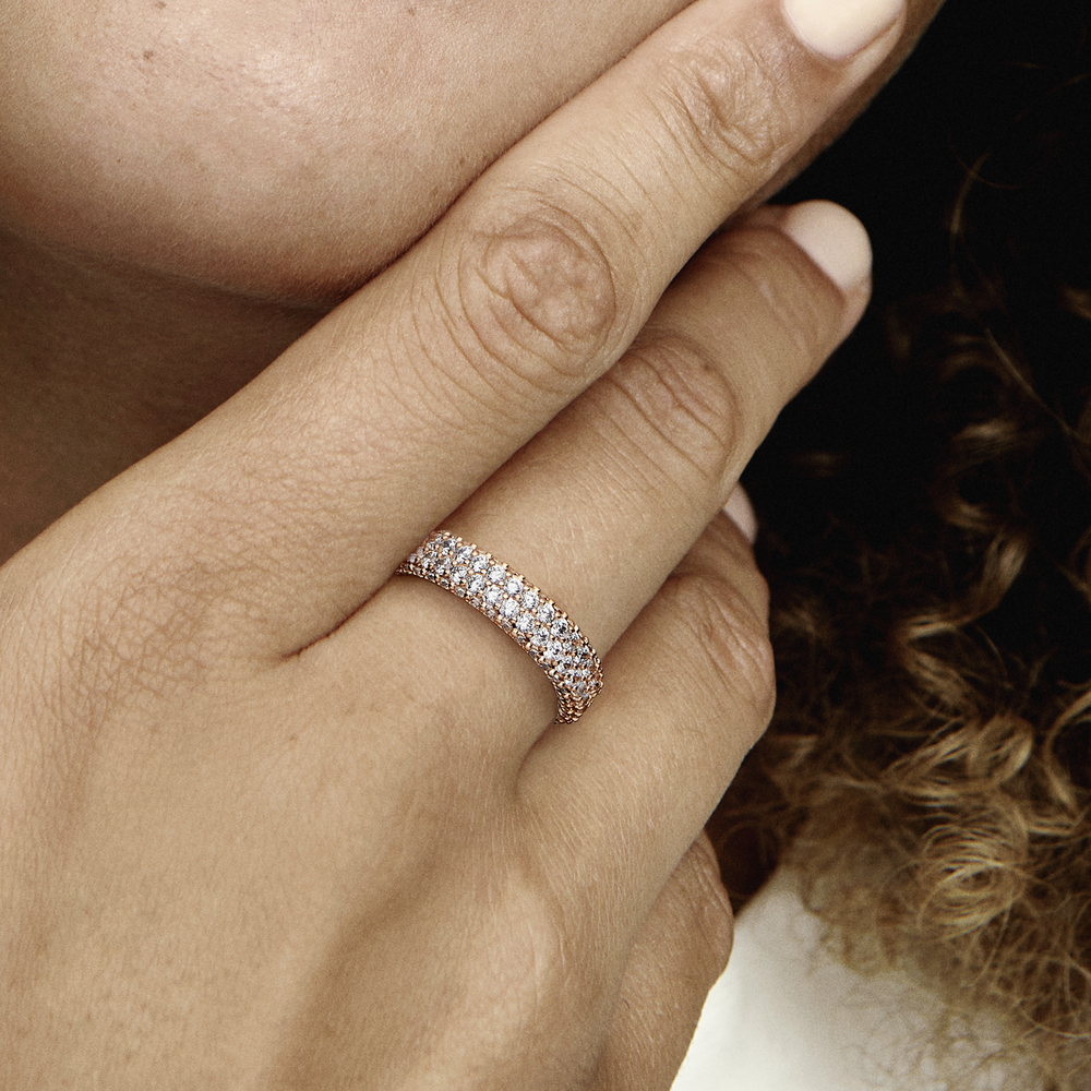 Maximise your sparkle with our Pandora Timeless Pavé Double-row Ring. With warm 14k rose gold plating, this hand-finished ring features two rows of clear cubic zirconia around the centre and one row facing outwards around each side, creating a slightly rounded square profile that sparkles from every angle. Wear it on its own or stacked with other Timeless Pavé rings to create as bold of a look as you want.
